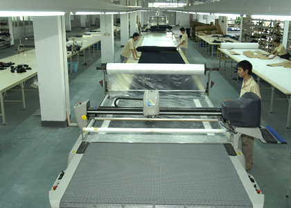 公司采用CAD計算機輔助排料系統(tǒng)進行排料,該系統(tǒng)準(zhǔn)確、高效。鋪料機代替手工鋪料的優(yōu)點使鋪料均勻、整齊、松緊適宜、降低工人勞動強度。